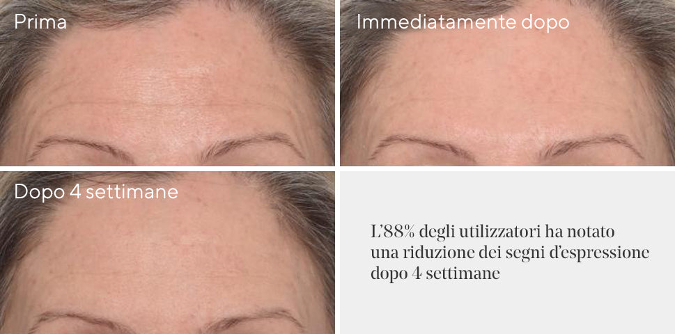 - Il 96% degli utilizzatori ha notato una texture più levigata nella zona di applicazione* - Il 90% il miglioramento delle rughe sulla fronte e il 100% delle righe glabellari** *Risultati riportati dai partecipanti di uno studio clinico. ** Risultato immediato dopo l'applicazione; risultati clinicamente testati tramite misurazione strumentale. Foto scattata subito dopo un'applicazione e dopo l'uso due volte al giorno di Targeted Wrinkle Corrector per 4 settimane; La fotografia "Dopo 4 settimane" mostra risultati a lungo termine sulla pelle nuda (nessun prodotto applicato). I risultati individuali possono variare.